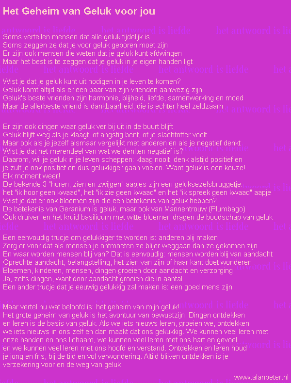 Maar vertel nu wat beloofd is: het geheim van mijn geluk!